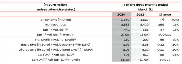 5月8日消息,意大利超跑品牌法拉利公布截至2024年3月31日的第一季度业绩,法拉利第一季度净收入为15.85亿欧元(约合人民币123亿元),较上年增长11%;调整后净利润为3.52亿欧元(约合人民币27亿元),同比增长19%;摊薄每股收益为1.95欧元;经调整EBITDA(税息折旧及摊销前利润)为6.05亿欧元,较上年增长13%。销量方面,法拉利第一季度汽车交付量为3560辆,较2023年同期减少7辆。这一下降主要受中国区下降20%的影响,欧洲和美洲的交付量增长未能抵消这一下降。具体来看,中国区第一季度销量为317辆,同比下滑20%;欧洲、中东和非洲地区销量为1573辆,同比增长3%;美洲地区销量为997辆,同比增长4%。(澎湃新闻)